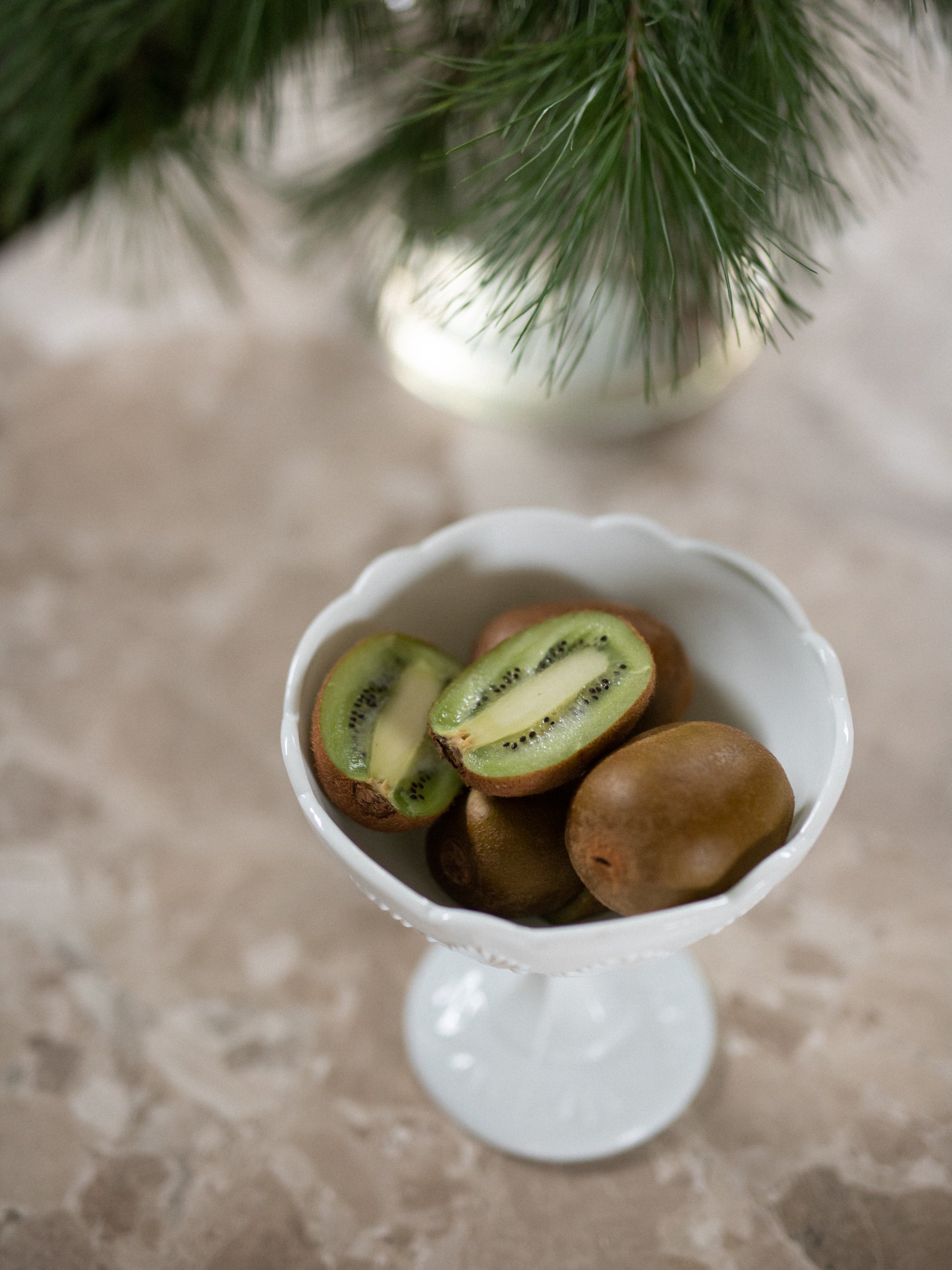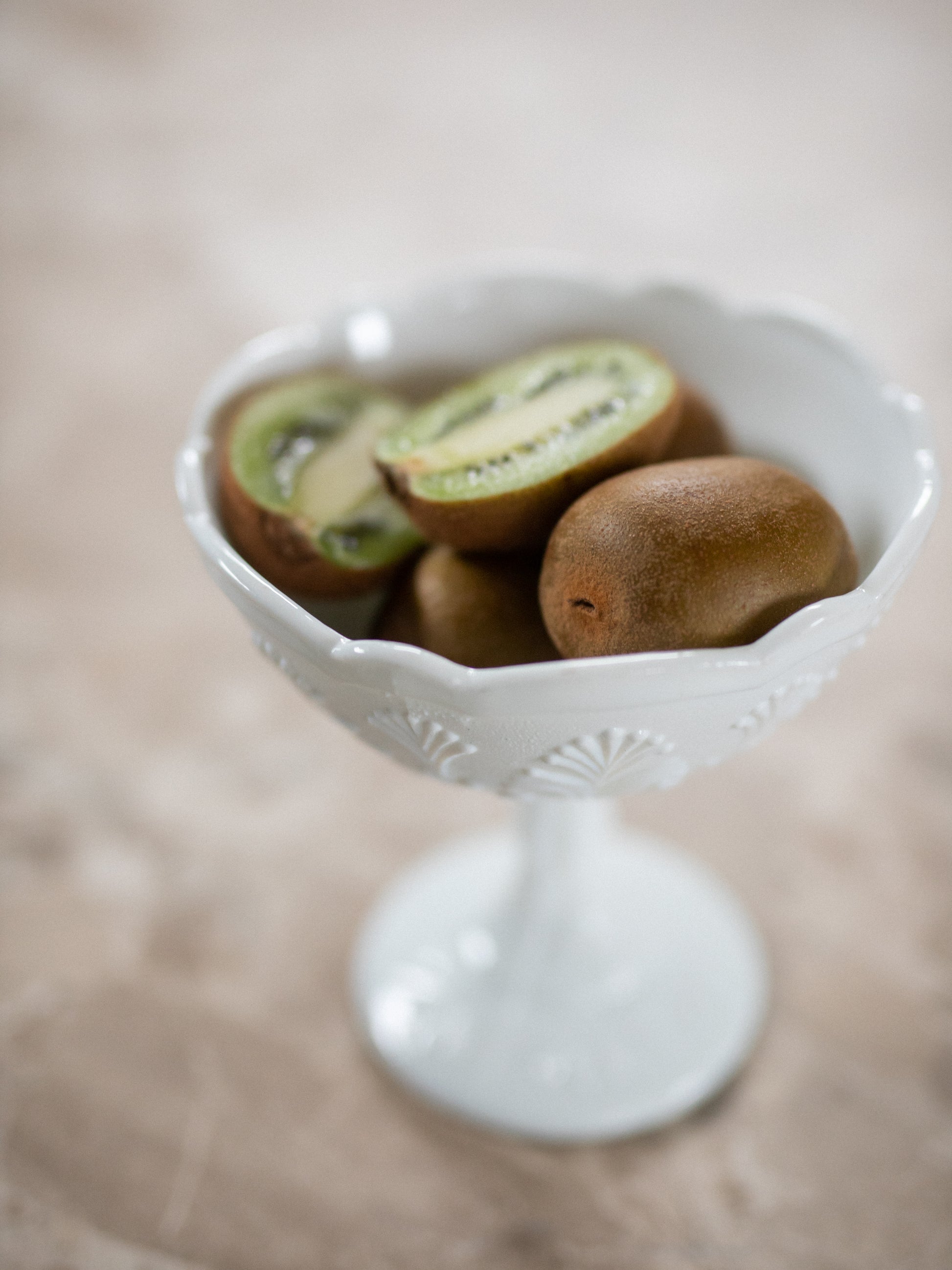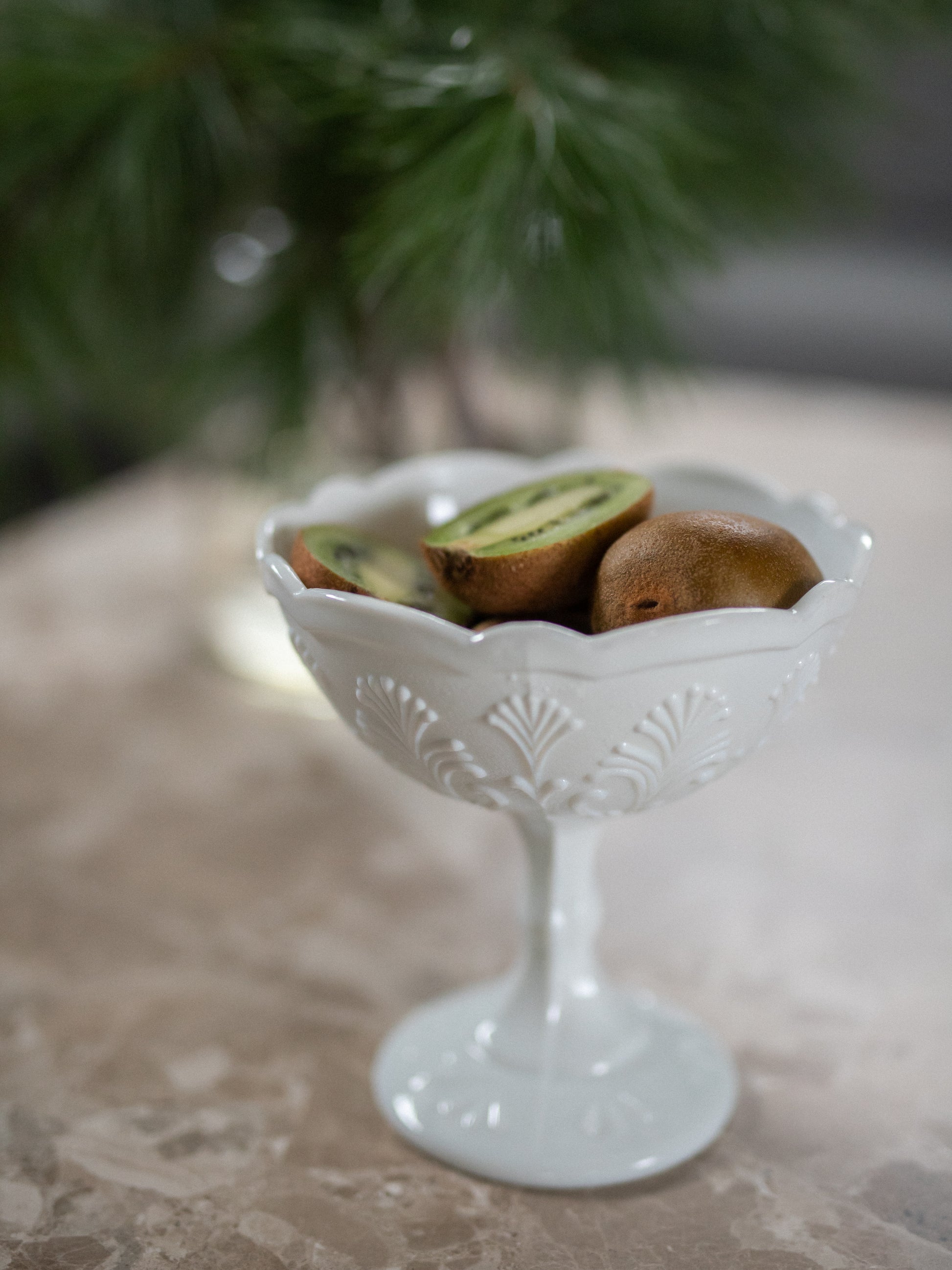 Skål med stett i hvitt pressglass.