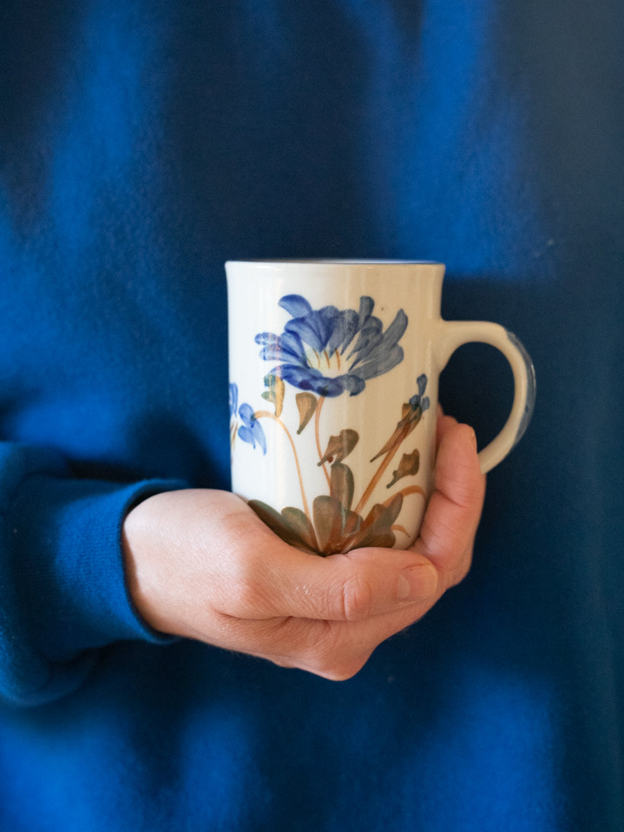 Nydelige kopper med blå blomster, vi har fire kopper. Tre nesten like og en som skiller seg litt ut fra de andre. 80,- pr. stk.