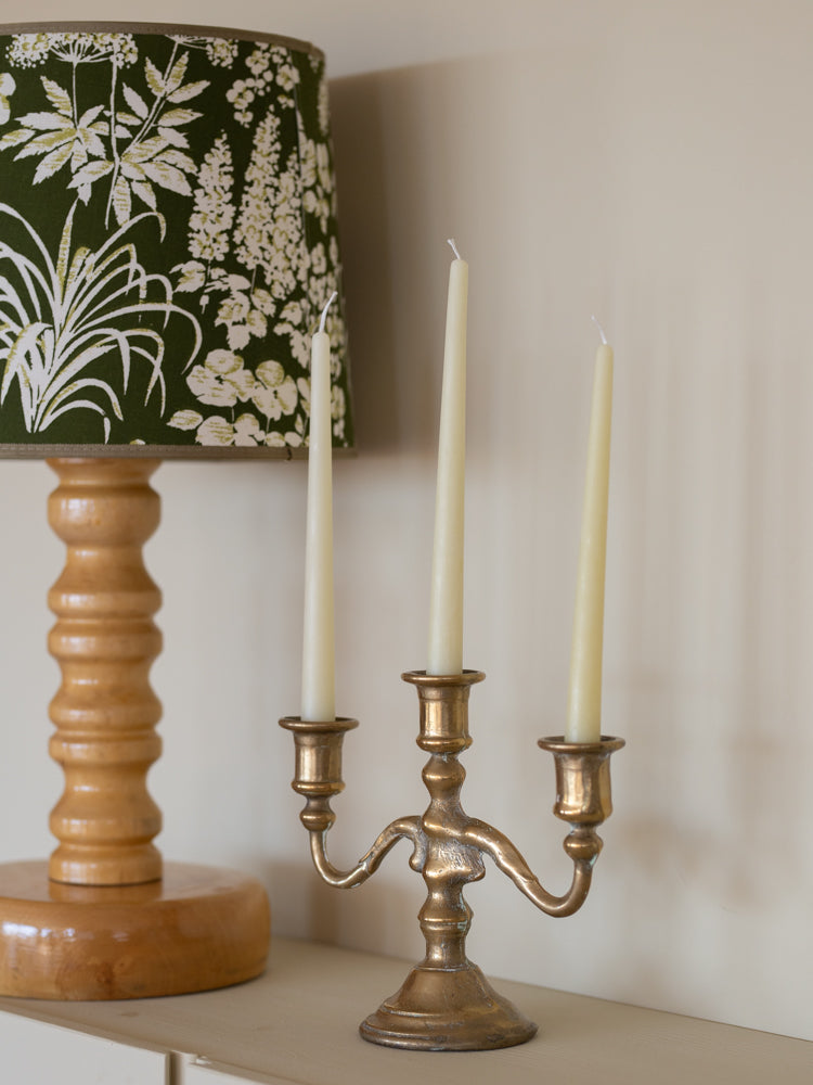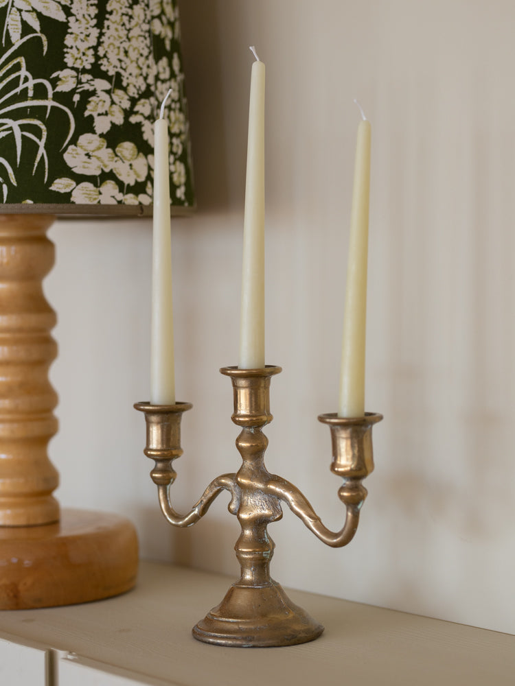Sjarmerende trearmet lysestake i messing.